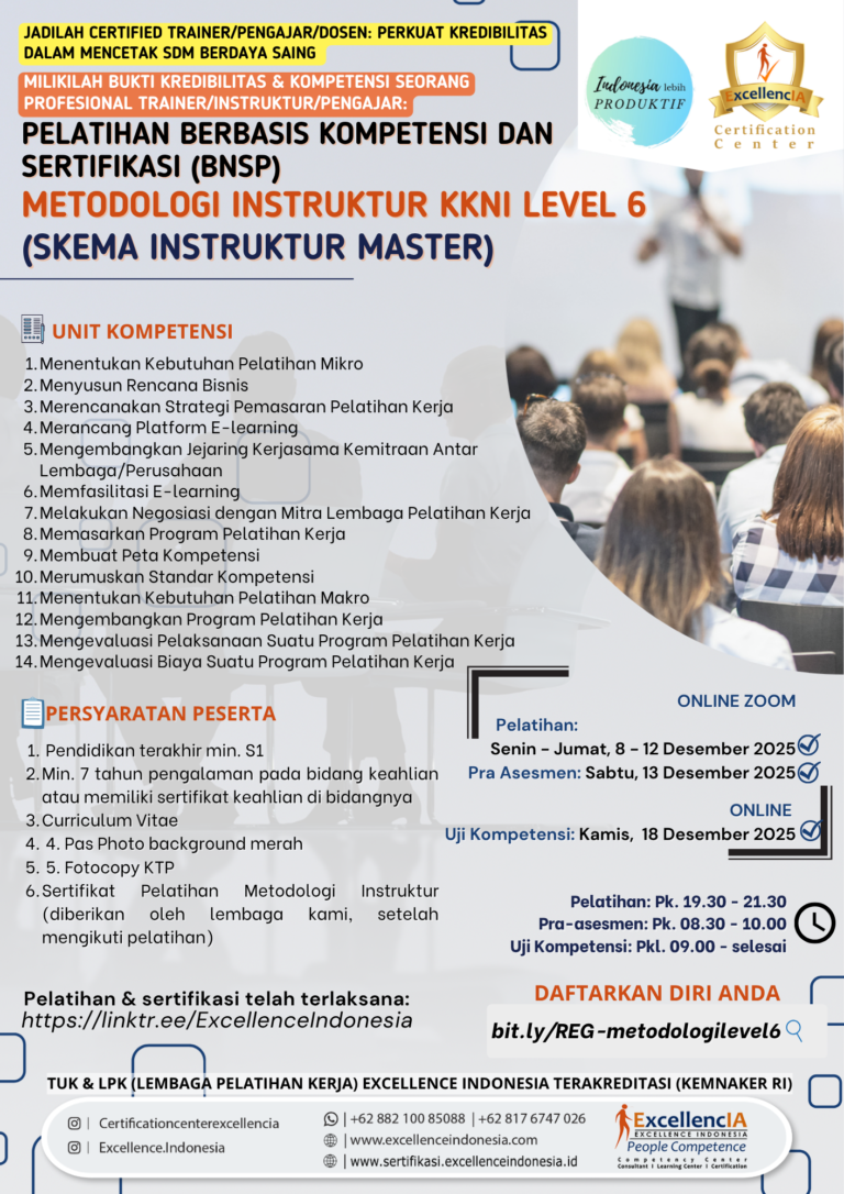 Jika Anda ingin tumbuh sebagai trainer profesional yang berdampak dan diakui secara nasional, maka Pelatihan dan Sertifikasi Metodologi Instruktur Level 6 (metodologi pelatihan) bersama Certification Center ExcellencIA adalah pilihan terbaik untuk mengukuhkan langkah Anda.