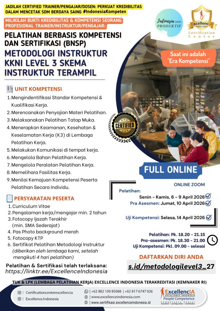 Jika Anda ingin tumbuh sebagai trainer profesional yang berdampak dan diakui secara nasional, maka Pelatihan dan Sertifikasi BNSP Metodologi Instruktur Level 3 (metodologi pelatihan) bersama Certification Center ExcellencIA adalah pilihan terbaik untuk mengukuhkan langkah Anda.